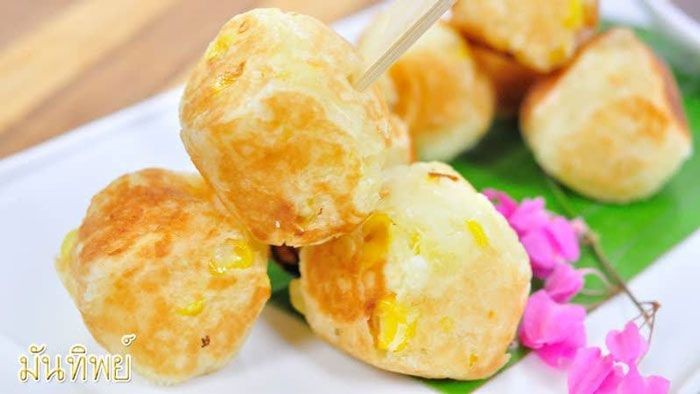 2. นำมันสำปะหลังที่นึ่งเสร็จร้อนๆ มาโขลก ใช้ส้อมหรือพายไม้ซุยให้เนื้อฟูๆจากนั้นนำมาผสมกับข้าวโพดหวานที่เตรียมไว้ ตามด้วยผงฟู คลุกเคล้าให้ส่วนผสมเข้ากันแล้วพักไว้