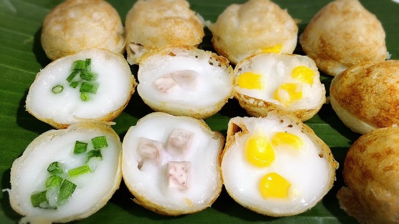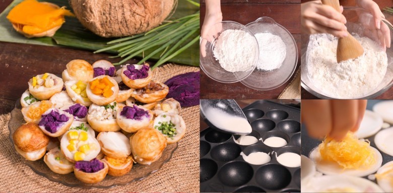 4. หยอดหางกะทิ ตามด้วยหัวกะทิ ประมาณ 1 ช้อนชา ต่อ 1 เบ้า โรยหน้าตามใจชอบ ปิดฝาทิ้งไว้ รอจนขอบแป้งเหลือง ใช้ช้อนแซะขึ้นใส่ภาชนะ