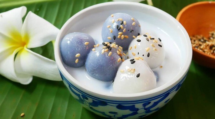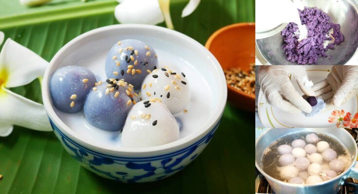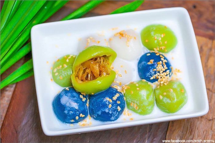 3. อ่างใส่แป้งข้าวเหนียวขาว ผสมน้ำเดือด ใช้พายยางตลบไปมา นวดจนนุ่มมือ (ถ้าแห้งให้เติมน้ำได้อีก หรือ ถ้าเหลวไปเติมแป้งได้) แป้งรวมเป็นก้อน แบ่งแป้งเป็นก้อนกลมเล็กๆ แผ่แป้งให้แบนออก ใส่ไส้ หุ้มให้มิด นำไปต้มในหม้อใส่น้ำน้ำ ตั้งไฟกลางอย่าให้น้ำเดือดแรง ใส่ก้อนแป้งลงต้มให้พอแป้งลอยตัว ตักขึ้น ผ่านน้ำเย็น สะเด็ดน้ำ
