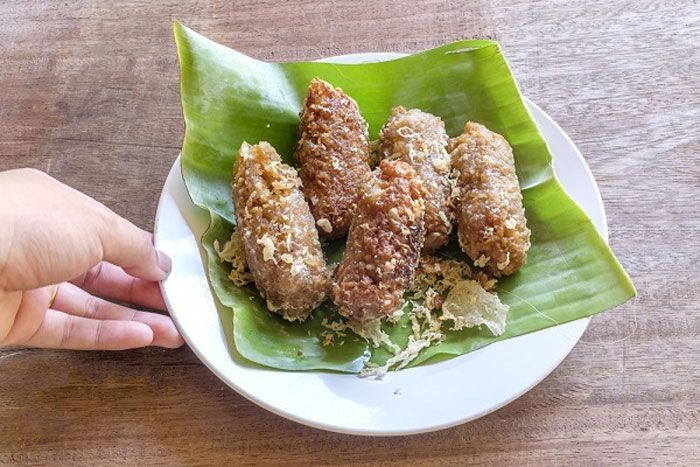 6. ทำฝอยข้าวเม่า โดยใช้มือจุ่มแป้งชุบทอดแล้วโรยลงในกระทะในขณะที่กำลังทอดกล้วยอยู่ ใช้ตะหลิวเขี่ยมารวมกันเป็นแพ ตักขึ้นวางบนกล้วยข้าวเม่า ตักน้ำมันราดบนฝอยจนเหลืองกรอบ