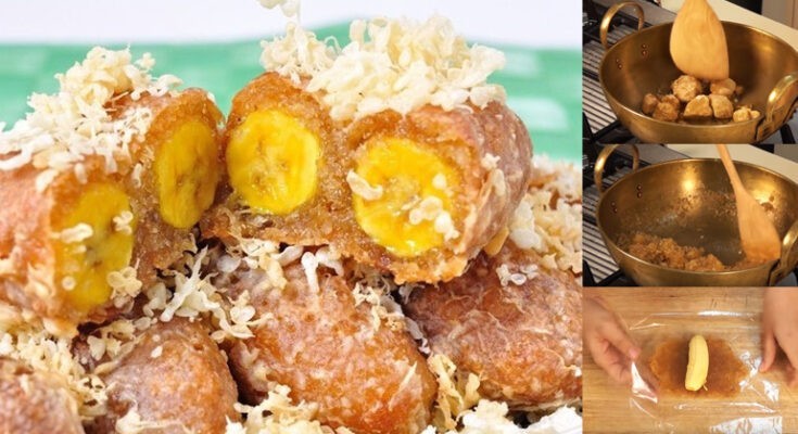 5. ใส่น้ำมันพืชลงในกระทะ นำขึ้นตั้งไฟแรง จากนั้นนำกล้วยชุบลงในส่วนผสมแป้งแล้วนำลงทอด