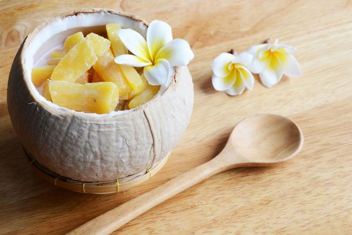 1. ใส่หางกะทิ น้ำตาลปี๊บ น้ำตาลทราย เกลือป่น และใบเตยลงในหม้อ นำขึ้นตั้งไฟกลาง คนให้น้ำตาลละลายหมด