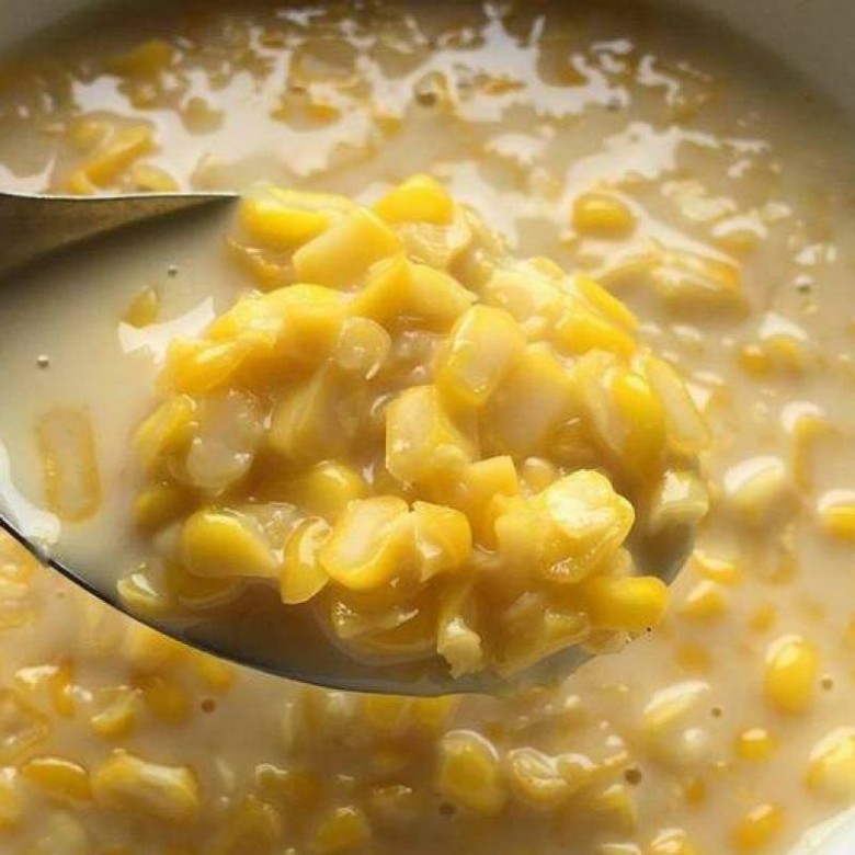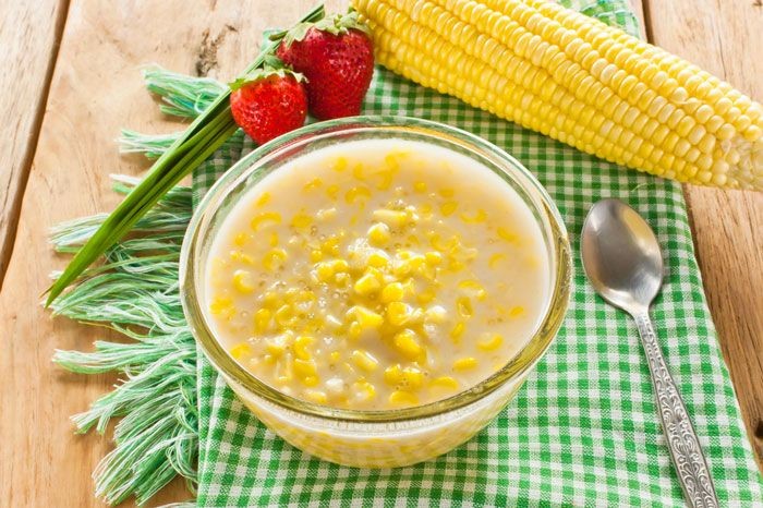 2. ใส่กะทิสดกับน้ำตาลปี๊บลงในหม้อ ใช้ไฟอ่อน ปรุงรสด้วยเกลือ รอจนน้ำตาลละลาย ใส่ข้าวโพดลงไปรอจนข้าวโพดสุก ตักใส่ถ้วย พร้อมเสิร์ฟ