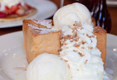 - หั่นขนมปังแล้วจัดลงจาน ตักไอศกรีมลงบนขนมปัง ราดวิปปิ้งครีมตามชอบ