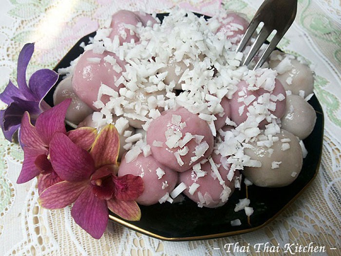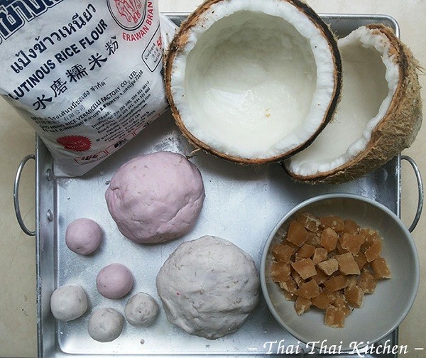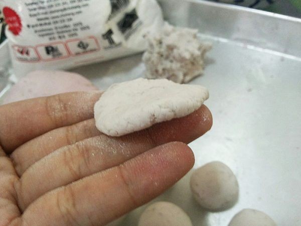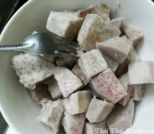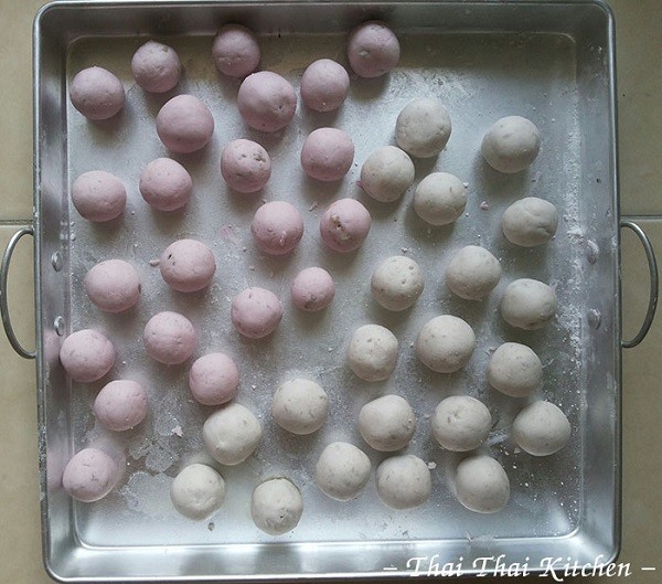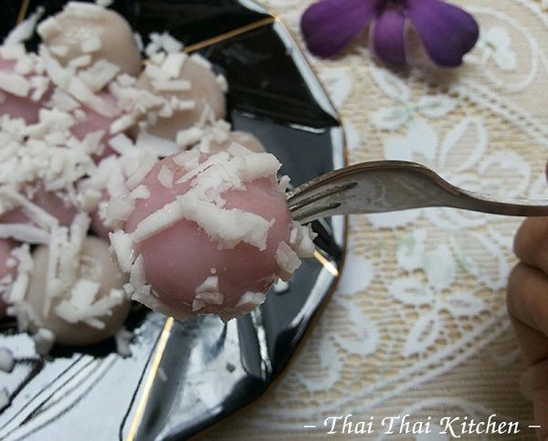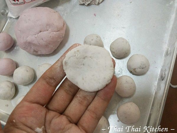 • ใช้ช้อนกับส้อมบดเผือกนึ่งเสร็จแล้วนำไปผสมกับแป้งข้าวเหนียว นวดผสมกันจนเป็นก้อน ถ้าส่วนผสมแห้งเกินไปก็เติมน้ำเข้าไปได้ค่ะ ถ้ารู้สึกว่าเหนียวไปก็ต้องเติมแป้งเพิ่ม ขั้นตอนนี้อาศัยการกะประมาณเอาล้วน ๆ เมนูนี้เลยไม่ได้มีอัตราส่วนมาให้ดูกัน ต้องขออภัยด้วยค่ะ ถ้าต้องการแป้งสีชมพูก็เอาน้ำหวานสีแดงผสมน้ำเปล่าเทใส่ลงไปแล้วนวดจนเข้ากัน ขั้นตอนนี้มือเราเลอะเลยไม่ได้ถ่ายเอาไว้เลย