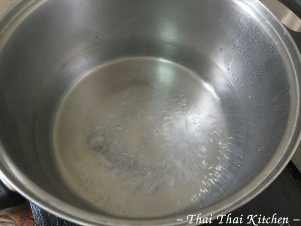 • ขั้นต่อไปเรามาเตรียมน้ำสำหรับลวกขนมกันค่ะ เติมน้ำสะอาดใส่ลงในหม้อ ตั้งไฟกลางรอจนน้ำเดือด อย่าลืมกะขนาดของหม้อและปริมาณของน้ำให้เหมาะกับปริมาณของขนมที่จะนำลงไปลวกด้วยนะคะ