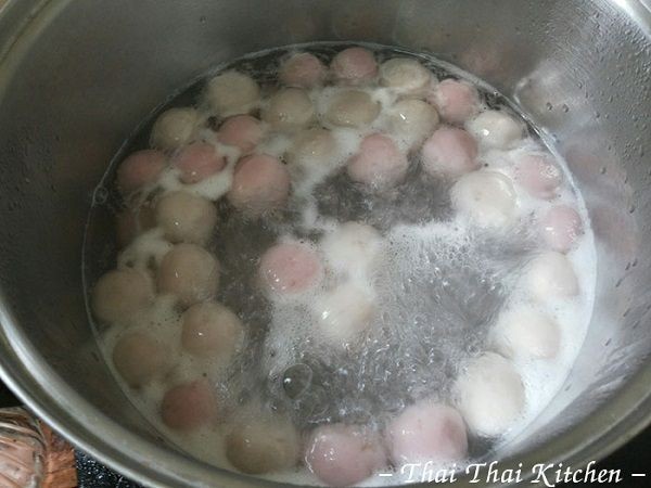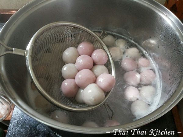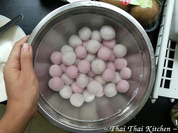 • นำขนมที่สุกแล้วไปแช่น้ำเย็นไว้ครู่หนึ่งกันขนมติดกันค่ะ (เราไม่ชอบให้ขนมติดกันเลยใช้วิธีนี้ แต่สูตรเดิมคือไม่ต้องแช่น้ำค่ะ)