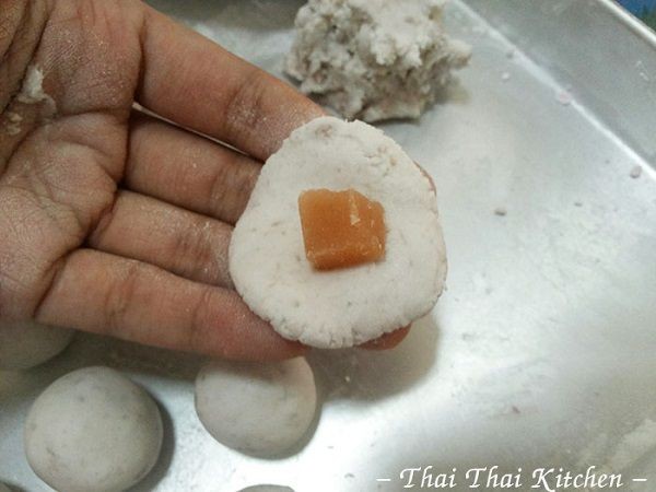 • เมื่อปั้นเป็นก้อนกลมแล้วก็แผ่เป็นแผ่นบางตามรูปเลยค่ะ กะความหนาให้พอดี สำหรับเราถ้าแป้งหนาไปรู้สึกว่ารสชาติไม่พอดีค่ะ แต่ถ้าแป้งบางไปไส้น้ำตาลจะทะลักได้