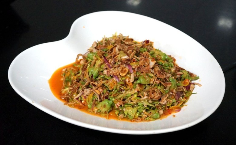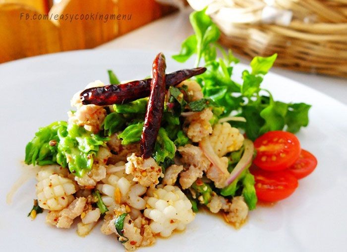 2.ใส่หมูสับรวน ดอกขจรลวกสุก และปลาหมึกลวก ใส่ข้าวคั่วเป็นลำดับสุดท้าย และตามด้วยหอมแดงซอย ต้นหอมซอย ผักชีฝรั่งซอย และใบสะระแหน่ คลุกเคล้าเบา ๆ ชิมรสตามชอบ พร้อมเสิร์ฟ
