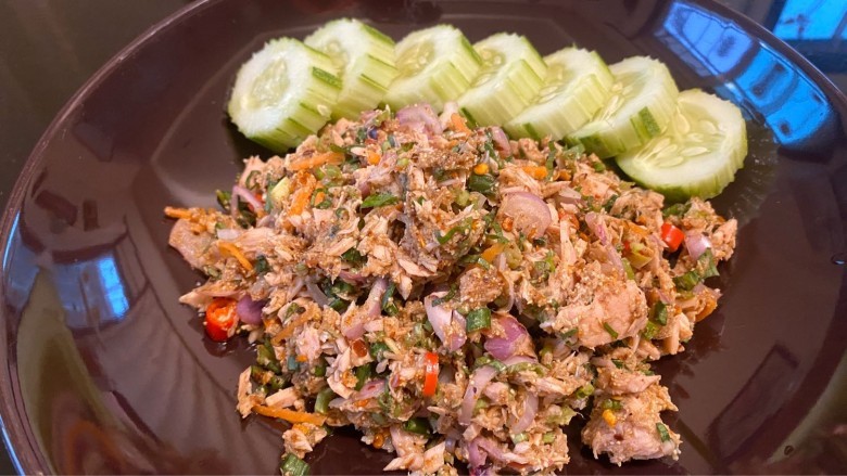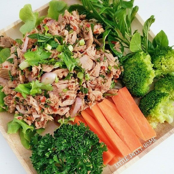 • เมนูนี้ใช้เนื้อปลาทูน่ากระป๋องในน้ำแร่ บีบน้ำออก ปรุงรสด้วยพริกป่น น้ำมะนาว และน้ำปลาโซเดียมต่ำ ใส่ข้าวคั่ว หอมแดงซอย ใบโหระพา ต้นหอมซอย และผักชีซอย กินคู่กับผักสดตามชอบ แซ่บนัวค่ะ