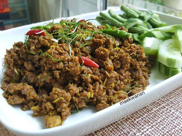 2. ปรุงรสตามชอบ ใส่ตะไคร้ ใบมะกรูดฝอยลงไป ผัดให้เข้ากัน ตักใส่จาน แต่งหน้าด้วยใบมะกรูดซอย เสริฟพร้อมผักสด