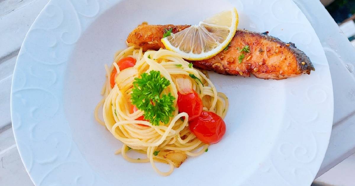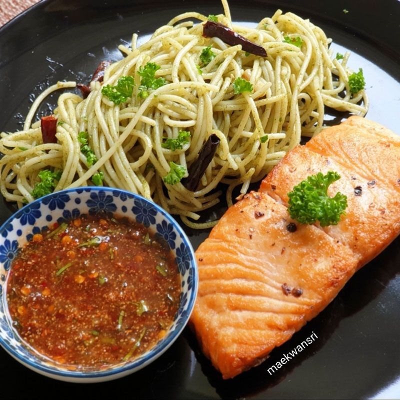 วิธีทำ : สปาเก็ตตี้1.ปั่นโหระพา เกลือ ใส่น้ำเล็กน้อยให้ละเอียดใส่น้ำมันมะกอกลงไปปั่นให้เข้ากันเตรียมไว้2.ต้มเส้นให้สุกพักไว้3.เจียวกระเทียมให้หอมใส่เส้นลงผัด ใส่ซอสโหระพาและเกลือลงไปผัดให้เข้ากัน จนได้กลิ่นหอม ตักใส่จาน เสริฟพร้อมปลาแซลมอนและน้ำจิ้มแจ่ว