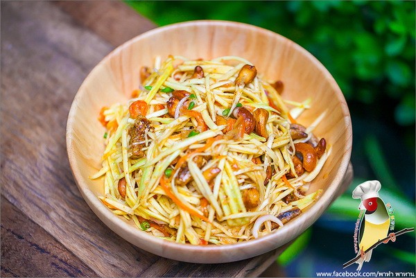 2.ใส่มะม่วงซอย หอมแดงซิย พริกซอย กุ้งแห้งลงไปคนให้เข้ากัน