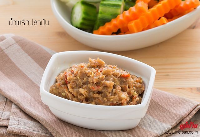 2. ปรุงรสด้วยน้ำมะนาว น้ำปลา และน้ำตาลทราย โขลกพอเข้ากันอีกครั้ง ตักใส่ภาชนะ จัดเสิร์ฟพร้อมผักสดและผักลวก