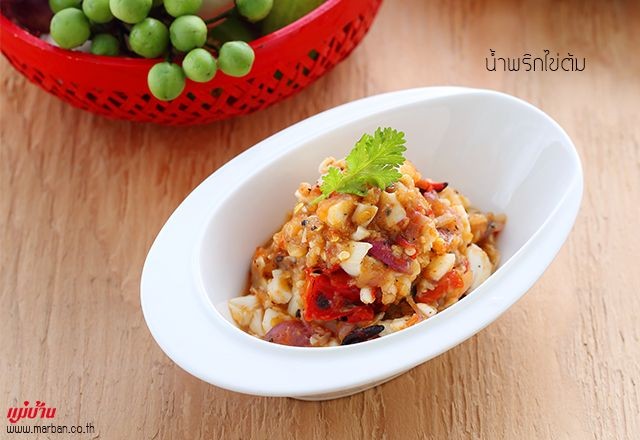 วิธีทำ น้ำพริกไข่ต้ม1. นำกระเทียม หอมแดง พริกสด ขึ้นบนเตาไฟพอสุกยกลง2. โขลกส่วนผสมในข้อที่ 1 พอแหลก ปรุงรสด้วยน้ำปลา น้ำมะนาว น้ำตาลปี๊บ โขลกให้เข้ากัน ใส่ไข่ต้ม คนให้เข้ากัน ตักใส่ภาชนะ จัดเสิร์ฟพร้อมผักสด และผักลวก