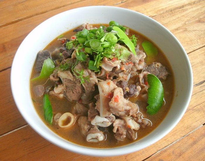 - รวนตับหมู หัวใจ เนื้อหมู และซี่โครงหมู กับเครื่องแกงพอหอมตักใส่หม้อ ใส่น้ำ ตั้งไฟ ให้เดือด