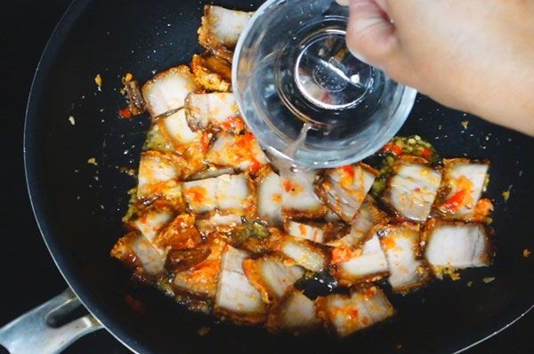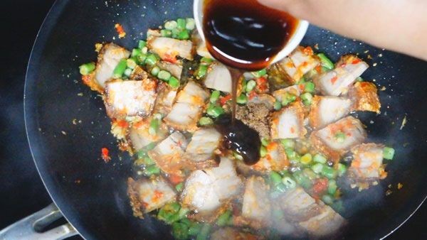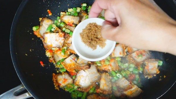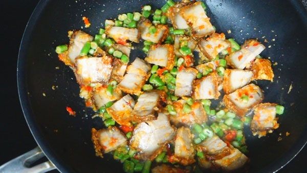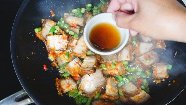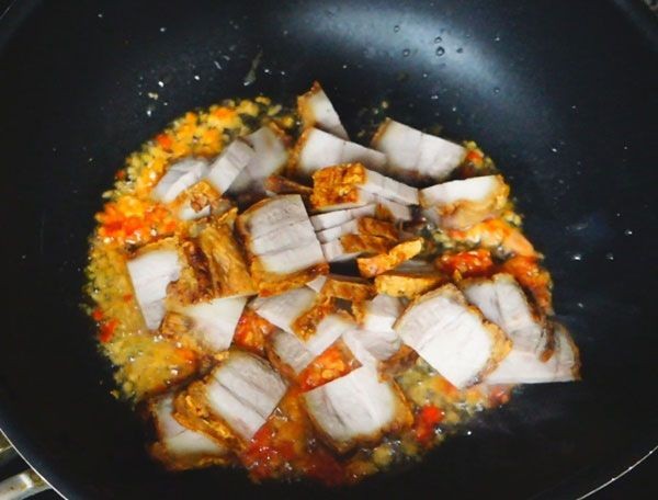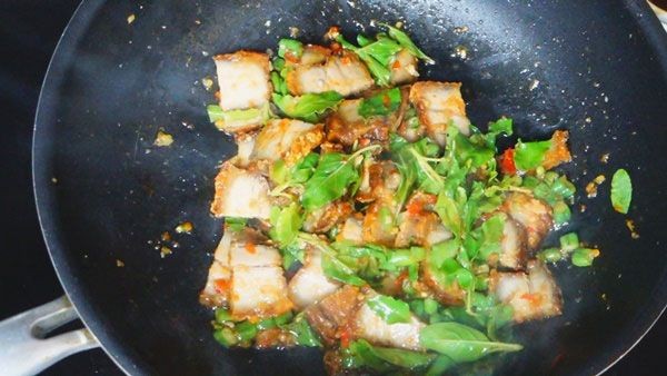 • ผัดแล้วก็ใส่หมูกรอบตามลงไปผัดให้สุกร้อนดีค่ะ