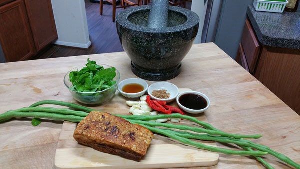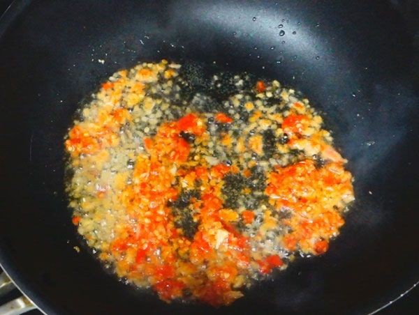 • เสร็จแล้วก็ตั้งกระทะใส่น้ำมันพืช ผัดพริกกับกระเทียมที่เราตำไว้ให้หอมฟุ้งไปทั่วบ้าน อยู่ที่นี่เวลาผัดต้องเปิดหน้าต่างรอไว้ก่อนค่ะ