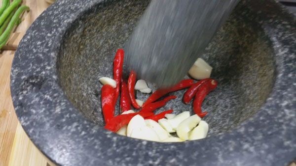 • มาเริ่มด้วยการตำพริกกับกระเทียมกันก่อน พริกใส่มากหรือน้อยตามชอบนะคะ