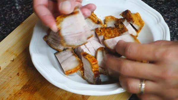 • หมูกรอบหั่นเป็นชิ้นตามชอบค่ะ เดี๋ยวตาลงวิธีการทำหมูกรอบแบบง่าย ๆ ไว้ให้นะคะ ดูได้ด้านล่างค่ะ