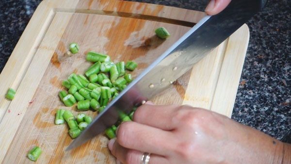 • หั่นถั่วฝักยาวขาวอวบของเรา หั่นยาวหรือสั้นตามแต่ชอบนะคะ