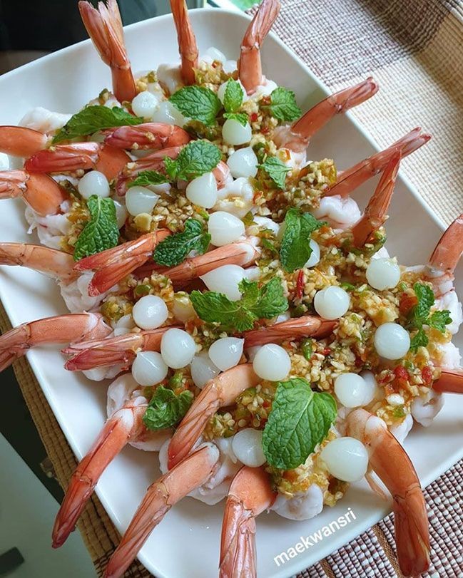 3.ต้มน้ำให้เดือดเอากุ้งลงไปลวกประมาณ2นาที (ขึ้นอยู่กับขนาดกุ้ง) เมื่อกุ้งสุกจัดใส่จานตักน้ำจิ้มที่เตรียมไว้ราดลงไปให้ทั่ว โรยหน้าด้วยกระเทียมดองและใบสาระแหน่