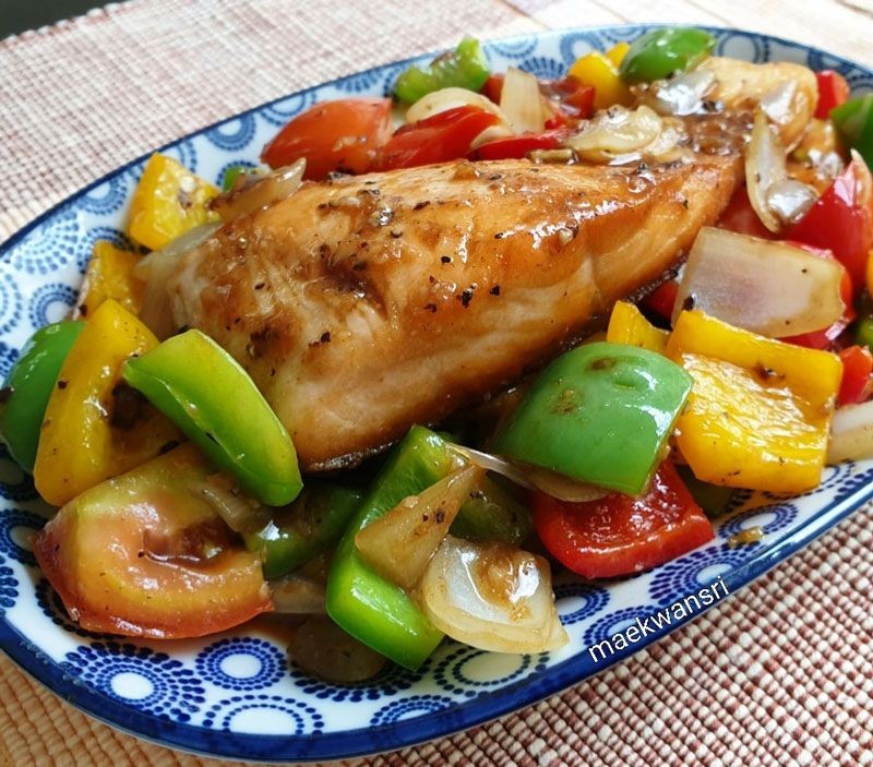 วิธีทำ ปลาแซลมอนหนังกรอบราด1.ตำกระเทียม/พริกไทยดำให้พอละเอียดพักไว้2.ทอดปลาลงในน้ำมันที่ร้อนเอาด้านหนังลงก่อน โรยเกลือ ทอดจนหนังกรอบแล้วค่อยกลับด้านทอดจนสุกพอดี พักไว้3.เอา(ข้อ1)มาผัดให้หอมใส่พริกหวาน/หอมใหญ่/ มะเขือเทศลงไป ผัดให้เข้ากัน