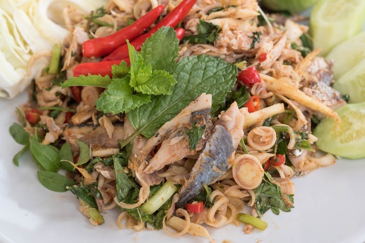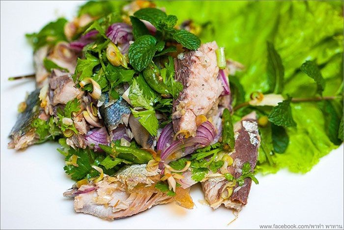 4. จัดใส่จาน โดยรองจานด้วยใบผักกาดหอมและใบสะระแหน่ ตักพล่าปลาทูวางด้านบน รับประทานได้ทันที