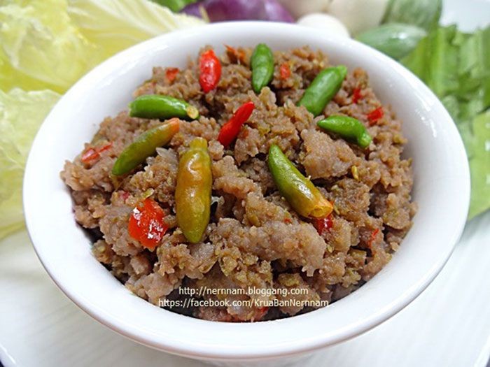3. ใส่น้ำมันในกระทะ ใช้ไฟค่อนข้างอ่อน ใส่น้ำพริกลงผัด ผัดจนหมูสุกและน้ำพริกแห้ง ชิมรสให้มีสามรส