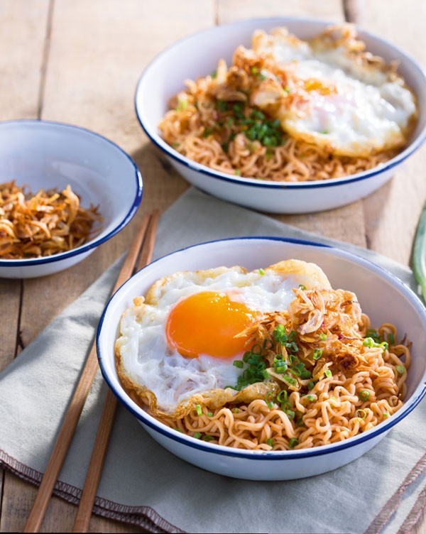 5. นำซอสไปคลุกกับเส้นบะหมี่ลวกให้ทั่ว ตักใส่ชาม โรยหอมแดงเจียวและต้นหอม โปะไข่ดาว จัดเสิร์ฟ