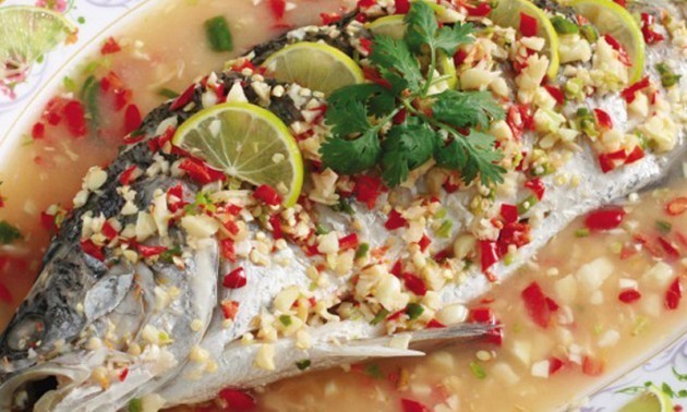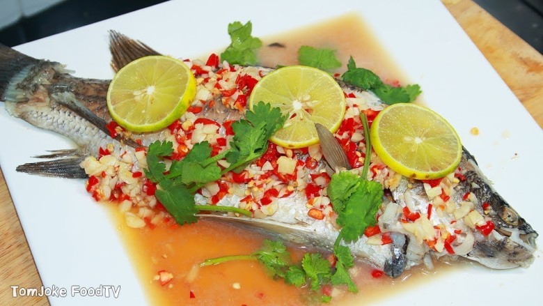 4. วางปลานึ่งลงในจาน ราดน้ำยำลงไป แต่งด้วยมะนาวฝาน และผักชีให้สวยงาม พร้อมเสิร์ฟ