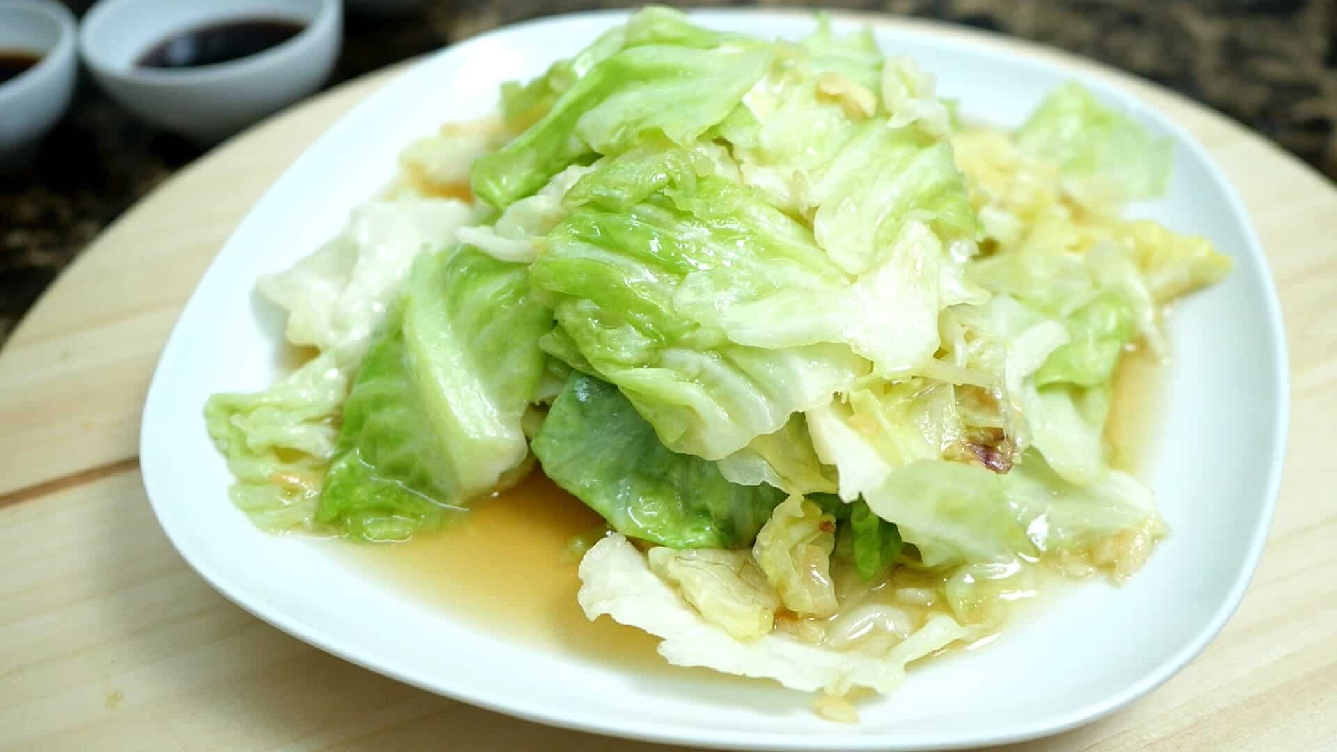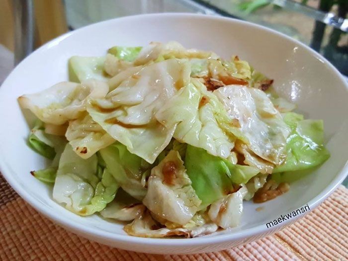 3. นำกะหล่ำปลีไปถูข้างกระทะให้ทั่ว เหยาะน้ำตาลลงไปเล็กน้อย ผัดให้เข้ากัน ตักเสริฟได้เลยจ้า