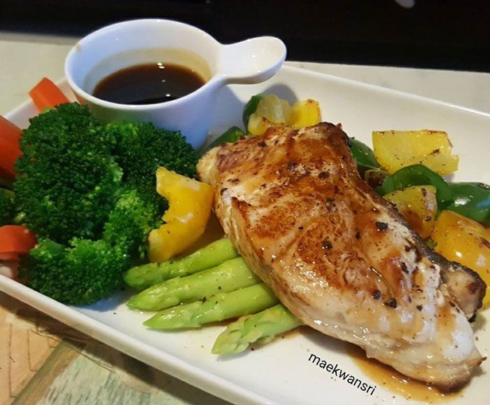 4.จัดจานวางปลาลงบนหน่อไม้ฝรั่ง และวางแครอท บล็อคโคลี่ แล้วราดด้วยซอสเทริยากิ แค่นี้ก็ได้สเต็กปลาอร่อยๆแล้วจ้าา