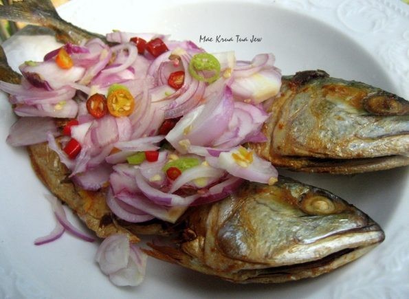 3.โรยหอมแดง,พริกซอย,ใบสาระแหน่ลงบนตัวปลาทู แล้วราดน้ำยำ..เสริฟพร้อมข้าวสวยร้อนๆได้เลย