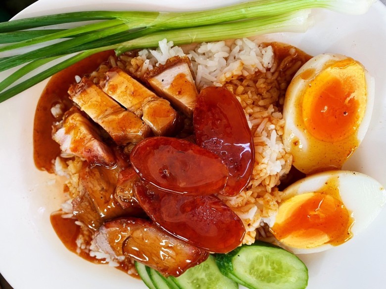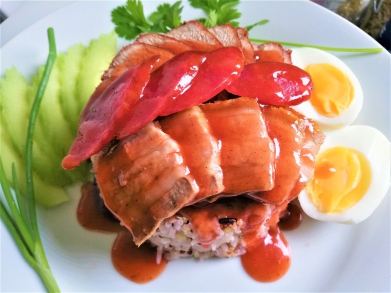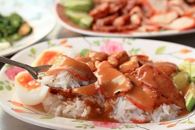- พักไว้ให้เนื้อหมู เริ่มคลายร้อนประมาณ 8 - 10 นาที แล้วจึงหั่นสไลซ์เป็นชิ้นๆ เสิร์ฟกับข้าวสวยร้อนๆ แตงกวา และไข่ต้มยางมะตูม จากนั้นราดด้วยน้ำราดข้าวหมูแดงทับ