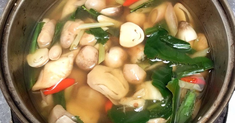 1.ต้มน้ำใส่ตะไคร้บุบ/ใบมะกรูด/ข่าบุบลงไป เหยาะเกลือลงไป ปล่อยให้น้ำเดือดและมีกลิ่นหอม ชิมรสให้ออกเค็มๆ