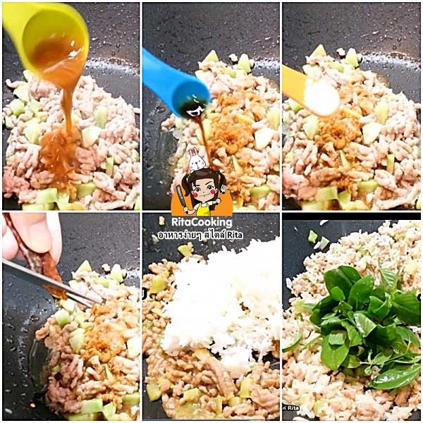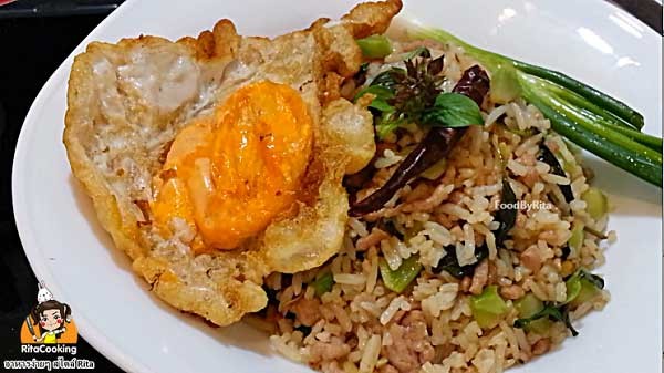 3. ใส่ข้าวสวยลงไปผัดให้เข้ากับเครื่อง จากนั้นใส่ใบโหระพาลงไปผัดให้เข้ากันเป็นอันเสร็จ