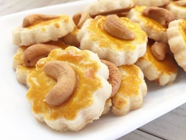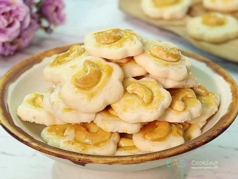 5. ทาด้านหน้าด้วยไข่แดงให้ทั่ว วางทับด้วยเม็ดมะม่วงหิมพานต์ผ่าครึ่งซีก ทำจนหมด เรียงใส่ถาด อบไฟ 400 องศาฟาเรนไฮต์ จนสุกเหลือง