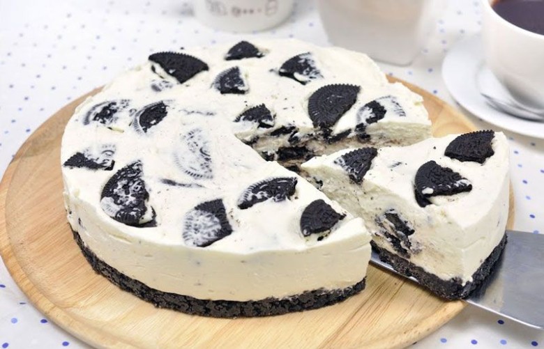 - นำส่วนผสมครีมชีสที่ได้ใส่ฐานโอรีโอที่แช่ตู้เย็นไว้ แล้วปาดหน้าให้เรียบตกแต่งหน้าให้สวยงามด้วยโอรีโอ ต่อจากนั้นนำพลาสติกปิดให้รอบ แล้วนำไปแช่ตู้เย็นให้อยู่ตัวอย่างน้อย 1 ชั่วโมงหรือทิ้งไว้ข้ามคืนก่อนรับประทาน