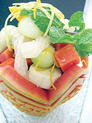 - นำฟรุตสลัดออกจากตู้เย็นตักใส่ถ้วยแก้ว แต่งหน้าด้วยใบสะระแหน่ยกเสิร์ฟเย็น ๆ