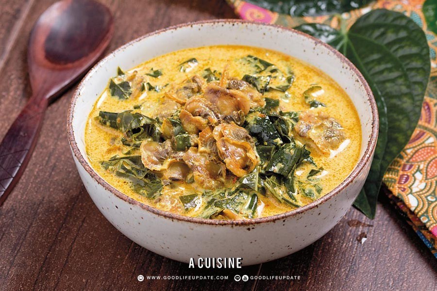 3. ผัดหัวกะทิกับน้ำพริกแกงจนมีกลิ่นหอม ใส่หอยแครง พอเดือดใส่ใบชะพลู หางกะทิ น้ำปลา น้ำตาลมะพร้าว ยกลง
