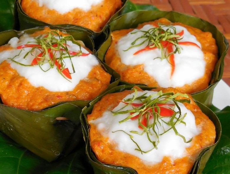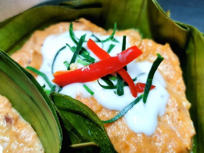 - เอาใบโหระพาใส่รองก้นในกระทงใบตอง แล้วตักเนื้อปลาแมคเคอเรลที่ผสมกับเครื่องแกงแล้วลงไปในกระทง ราดหน้าด้วยหัวกะทิ และโรยหน้าด้วยใบมะกรูดซอย