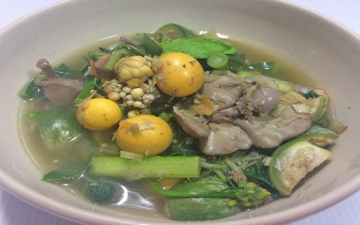 - ต้มน้ำซุปจนเดือด ใส่น้ำพริกแกงละลายให้เข้ากัน ปรุงรสด้วยน้ำปลา น้ำปลาร้า แล้วจึงใส่เครื่องในไก่ลงไปต้มจนสุก ใส่ใบพริก ชะอม ข้าวคั่ว ผักชีลาว ต้มพอเดือดยกลง เสิร์ฟขณะร้อนๆ