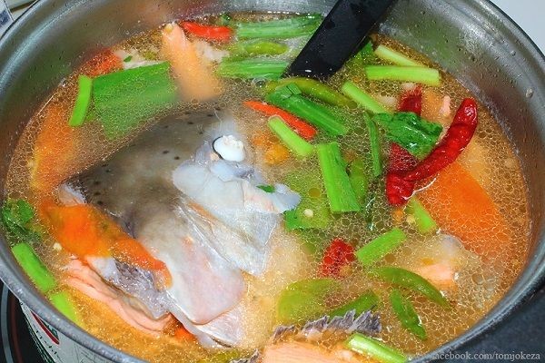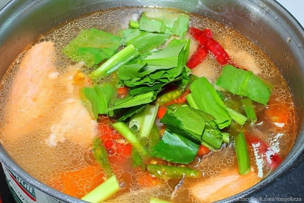 - ต้มน้ำซุปให้เดือด ใส่ข่า ตะไคร้ ใบมะกรูด ต้มจนมีกลิ่นหอม จึงใส่ปลาแซลมอนลงไปต้มพอสุก