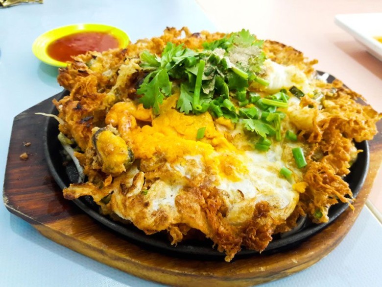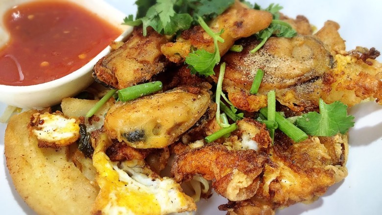 - ตั้งกระทะที่ไฟปานกลาง ใส่น้ำมันลงไปครึ่งหนึ่ง พอน้ำมันร้อน แบ่งแป้งและหอยแมลงภู่อย่างละครึ่งใส่ลงไปในชามผสม คนให้เข้ากันแล้วจึงเทลงไปในกระทะ