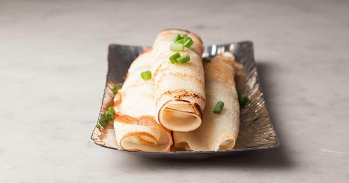 - พอแป้งเริ่มเดือดได้ที่ ก็ใส่ต้นหอมกับข้าวโพด แล้วก็ค่อยๆ ม้วน จัดใส่จาน