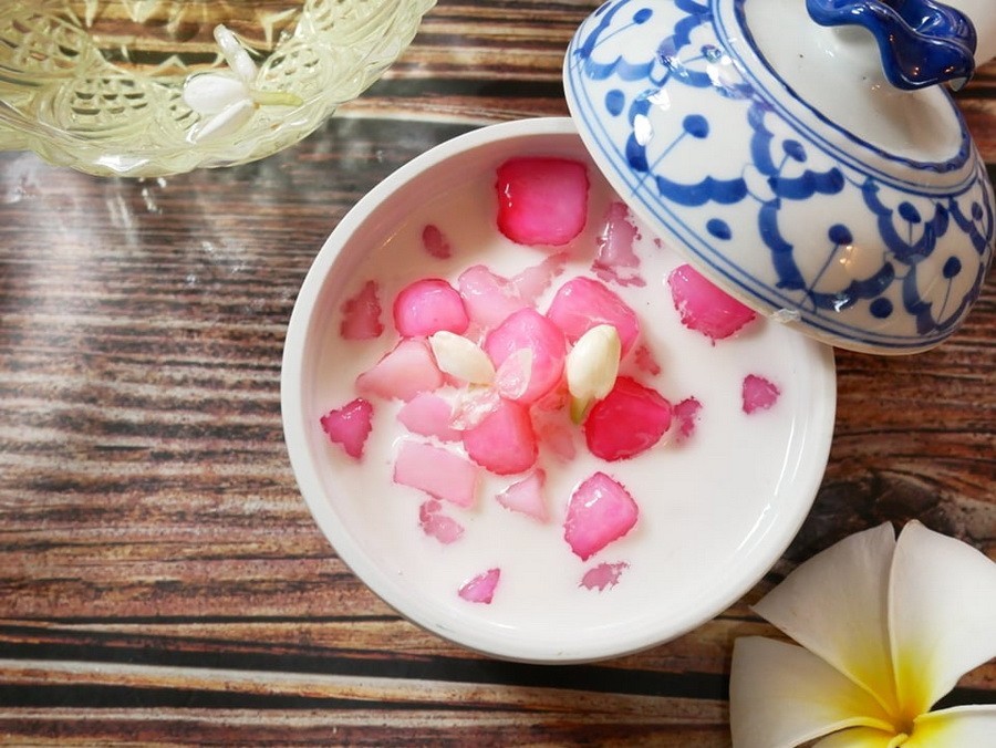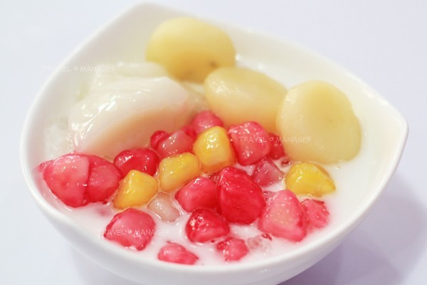 - นำเมล็ดทับทิม ไปใส่ในถ้วยเสิร์ฟ โรยหน้าด้วยเกล็ดน้ำแข็ง ราดด้วยน้ำเชื่อม,น้ำกะทิ, ขนุนฝอยและข้าวโพด (ถ้าต้องการ) เสิร์ฟทันทีเป็นอาหารว่าง
