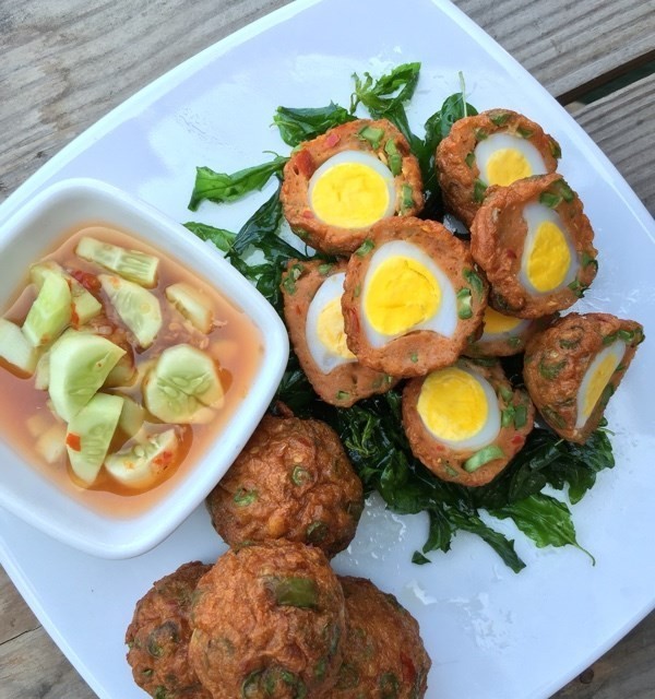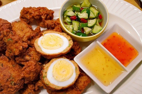 - เปิดเตาที่ไฟปานกลาง ตั้งกระทะ ใส่น้ำมันลงไป รอจนน้ำมันร้อน นำส่วนผสมประมาณ 1 ช้อนโต๊ะครึ่งมาปั้น ใส่ไข่นกกระทาตรงกลาง แล้วนำลงทอด ทอดแต่ละด้านจนสุกดี ตักขึ้นพักไว้บนกระดาษซับน้ำมัน