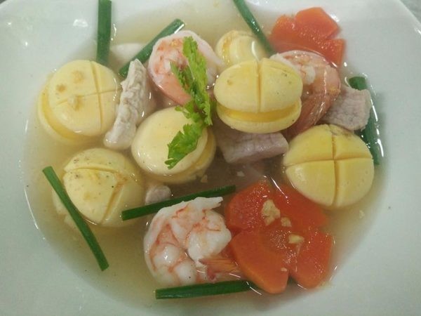 - ตั้งน้ำซุปในหม้อด้วยไฟร้อนปานกลาง เมื่อน้ำเดือด ใส่หมูสับที่ปั้นเตรียมไว้ลงไปต้ม จากนั้นจึงใส่กุ้งลงไปต้มต่อจนเกือบสุก ปรุงรสด้วยน้ำปลา