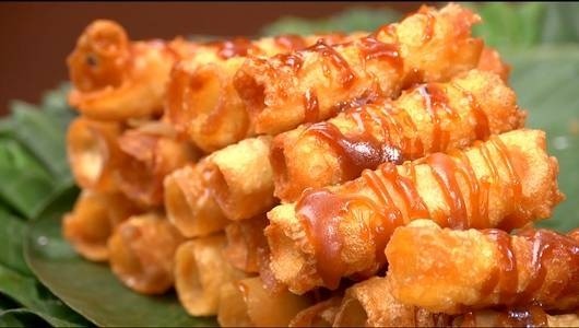 - คลึงแป้งให้หนาประมาณ 1/8 นิ้ว แล้วจึงพันไปรอบไม้ไผ่ (ต้องเหลือปลายไม้ไผ่ข้างละ 1 นิ้ว) ปิดรอยต่อให้เรียบ ตัดแป้งหัว-ท้าย ให้เรียบเสสสมอกัน
